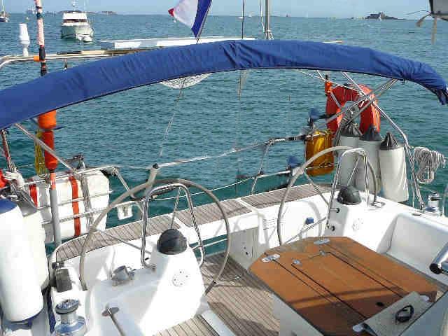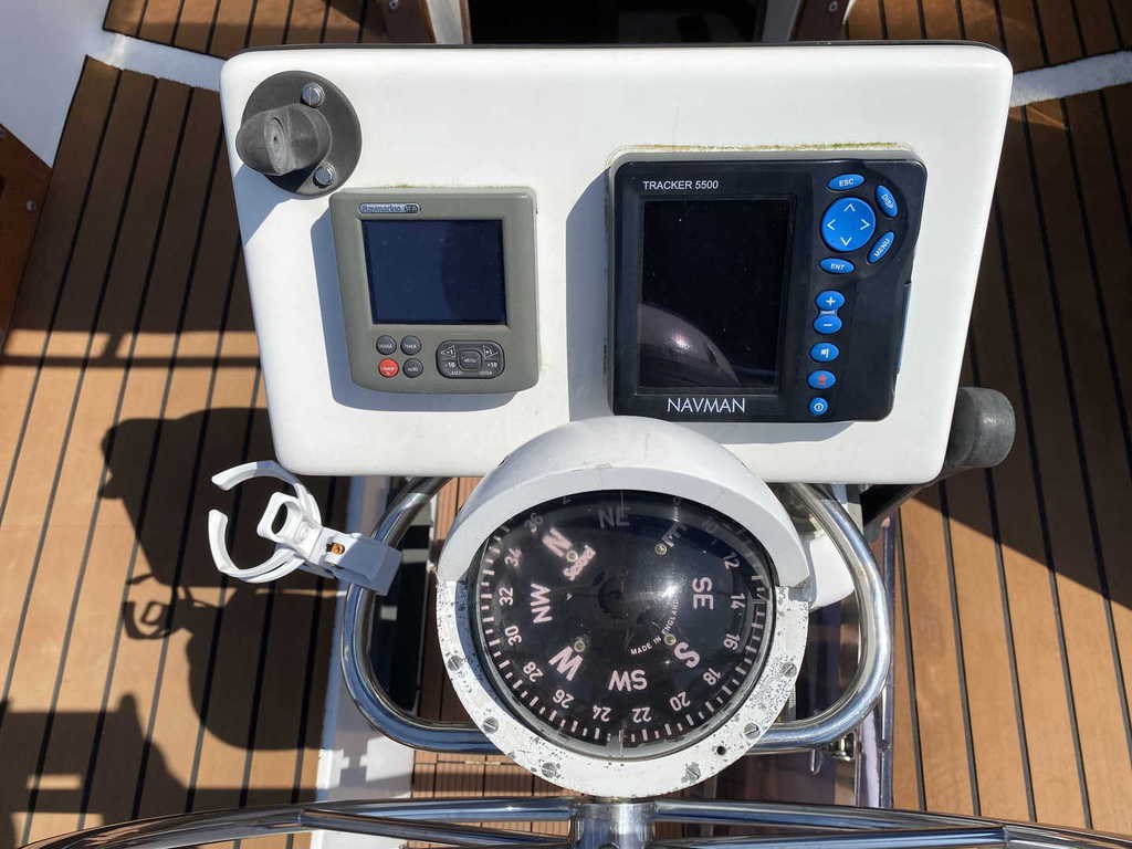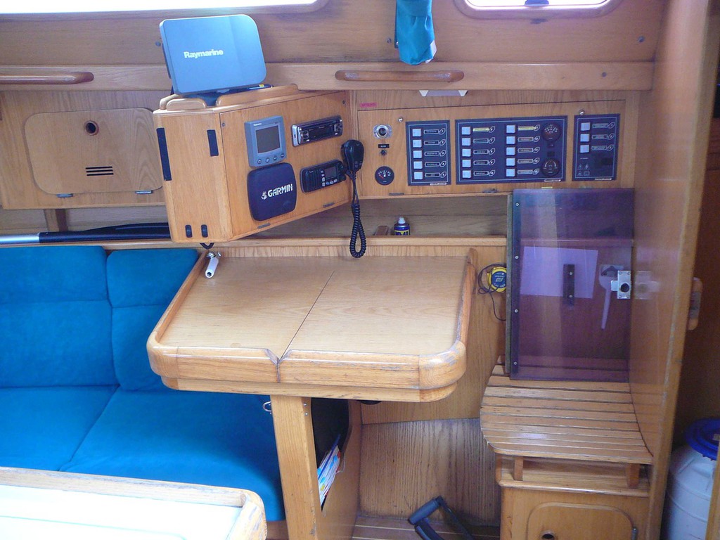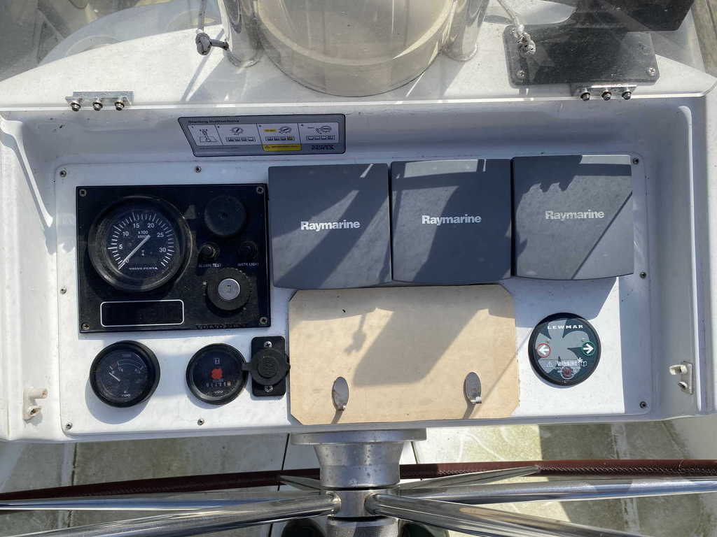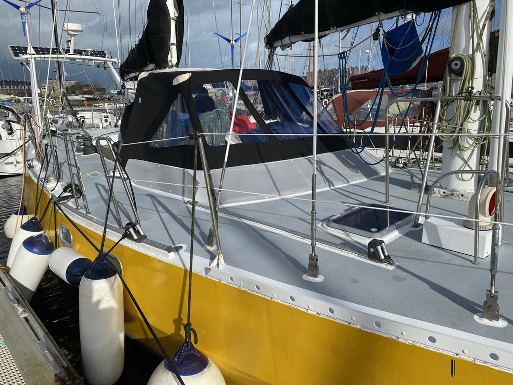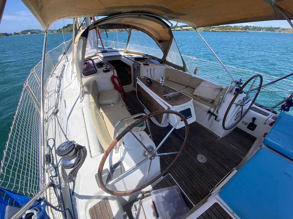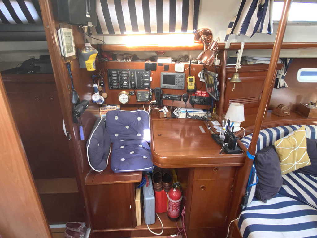 cartes, radar, VHF. Bateau bien équipé avec capote de roof, eau chaude, table de cockpit, annexe et HB.
