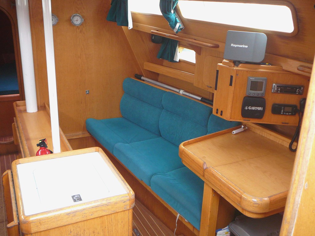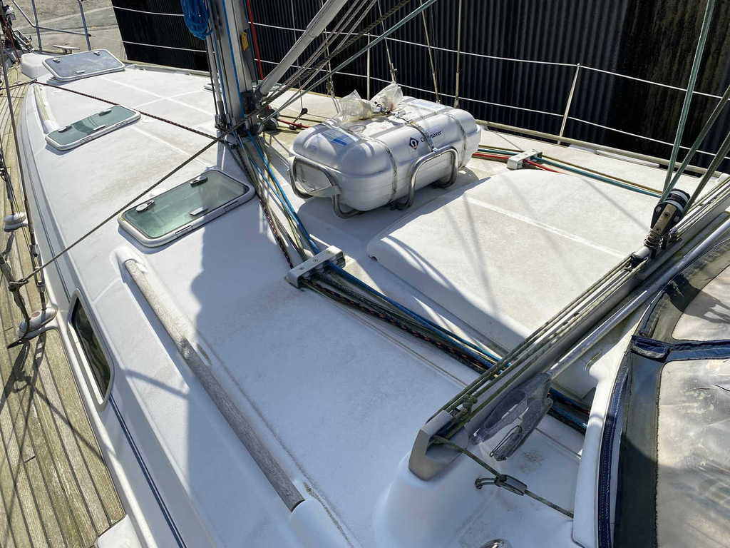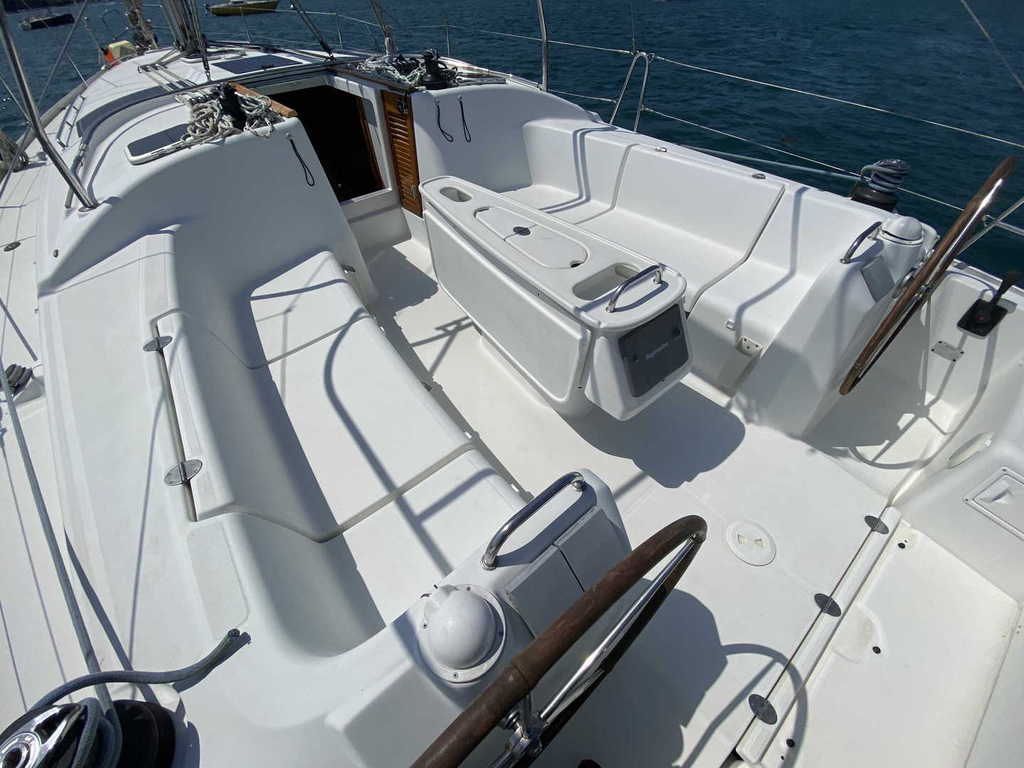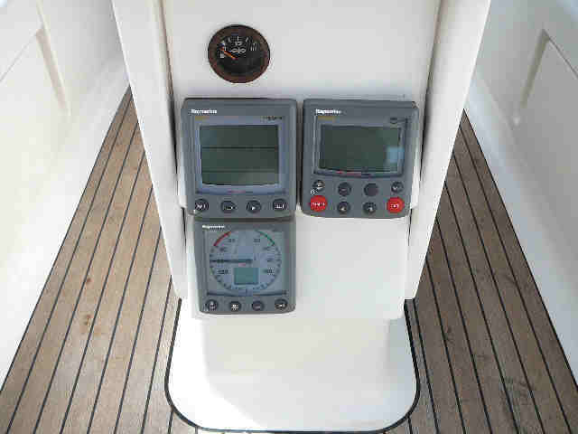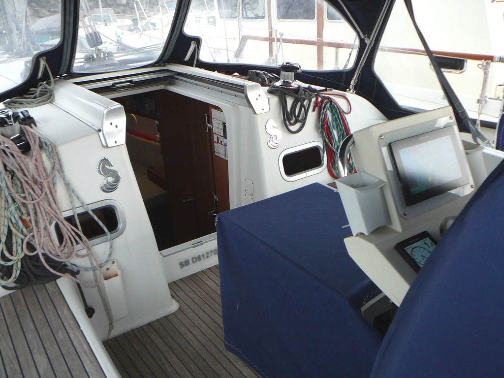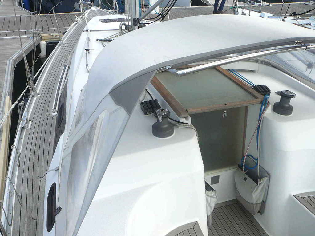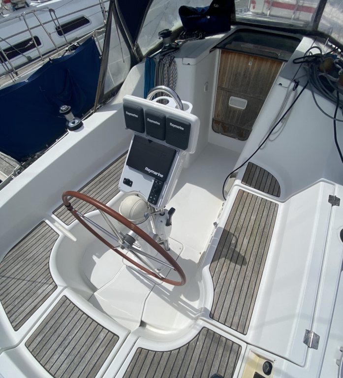 cartes, radar, VHF. Bateau bien équipé avec capote de roof, eau chaude, table de cockpit, annexe et HB.