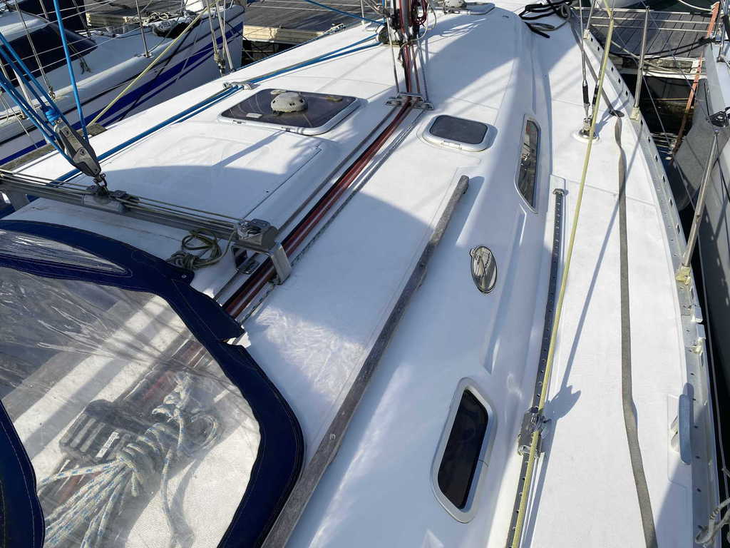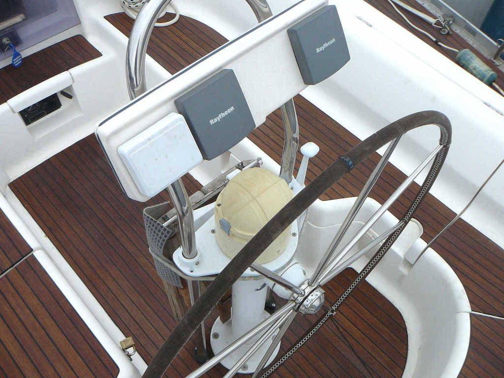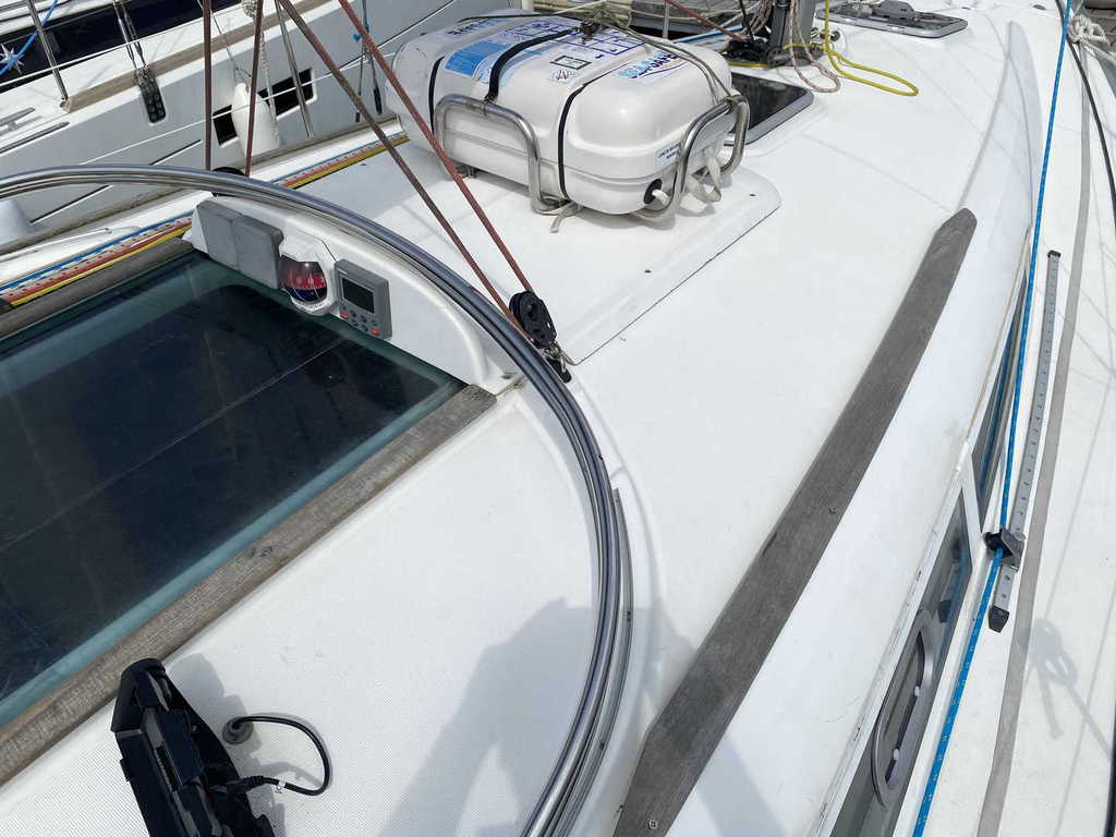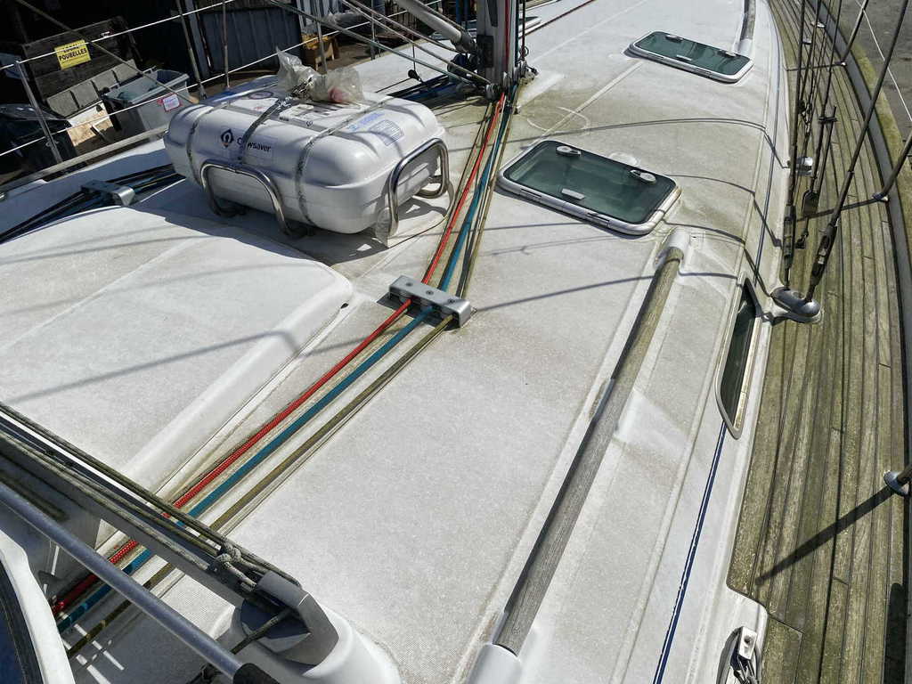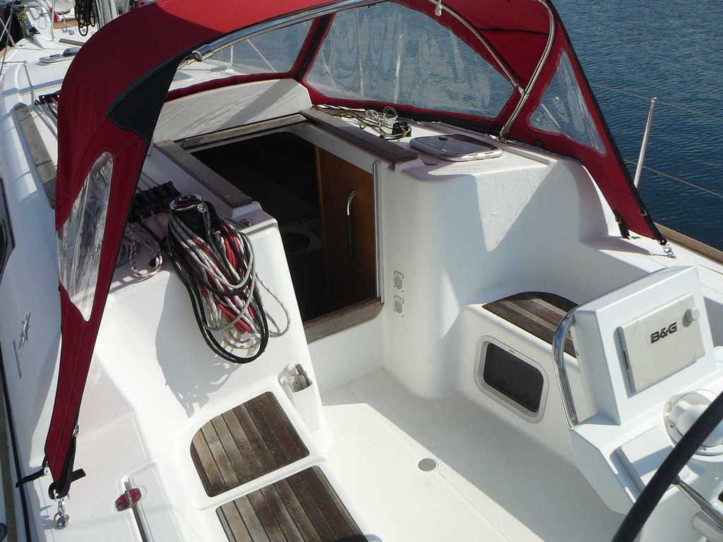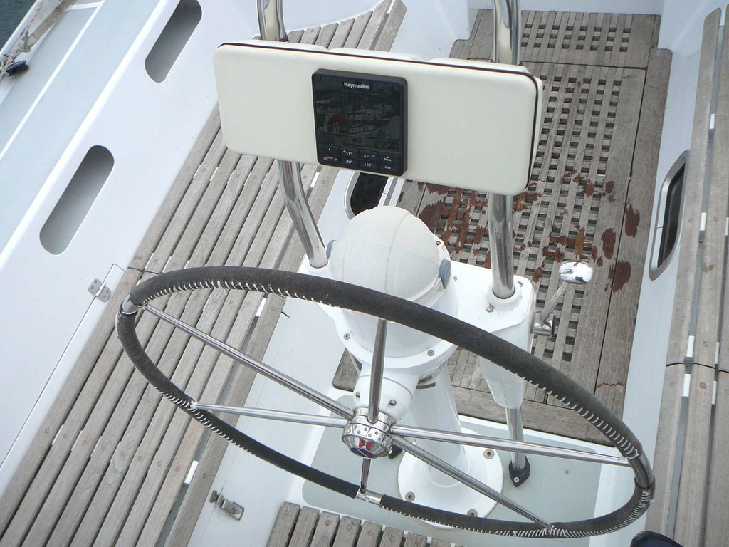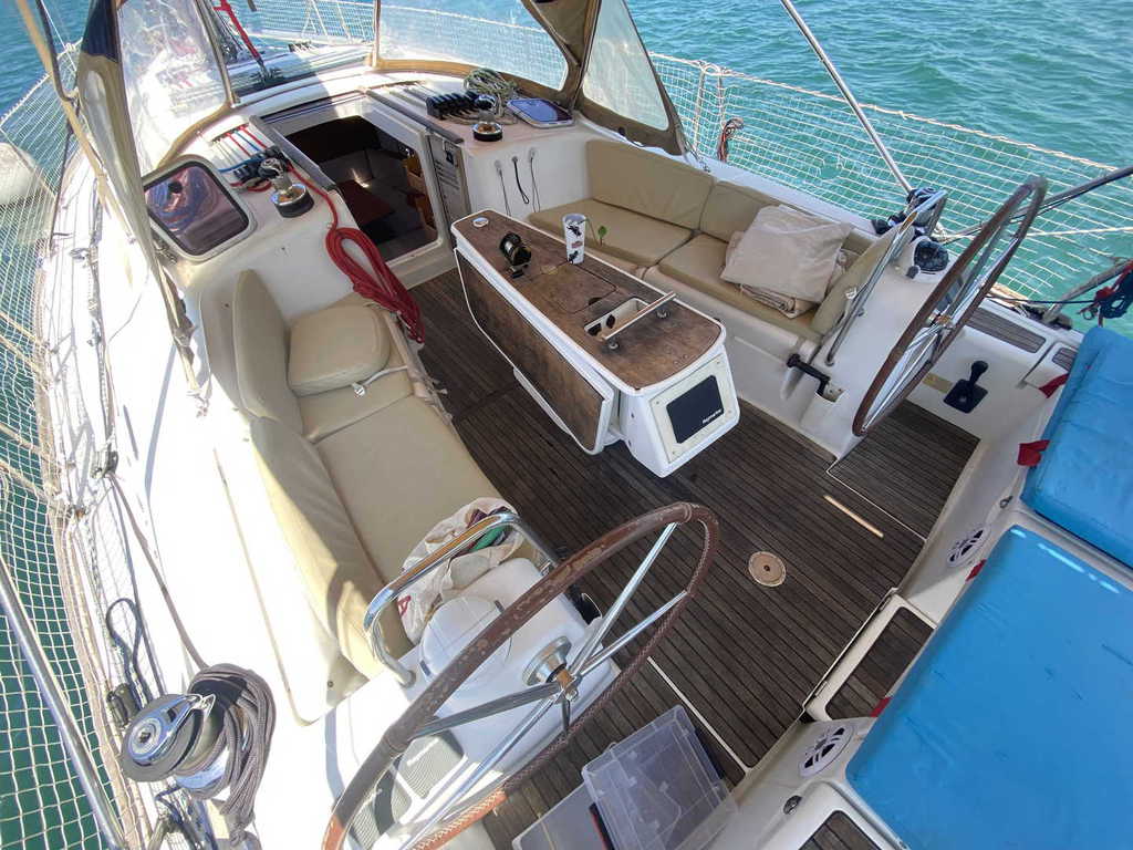 cartes, radar, VHF. Bateau bien équipé avec capote de roof, eau chaude, table de cockpit, annexe et HB.