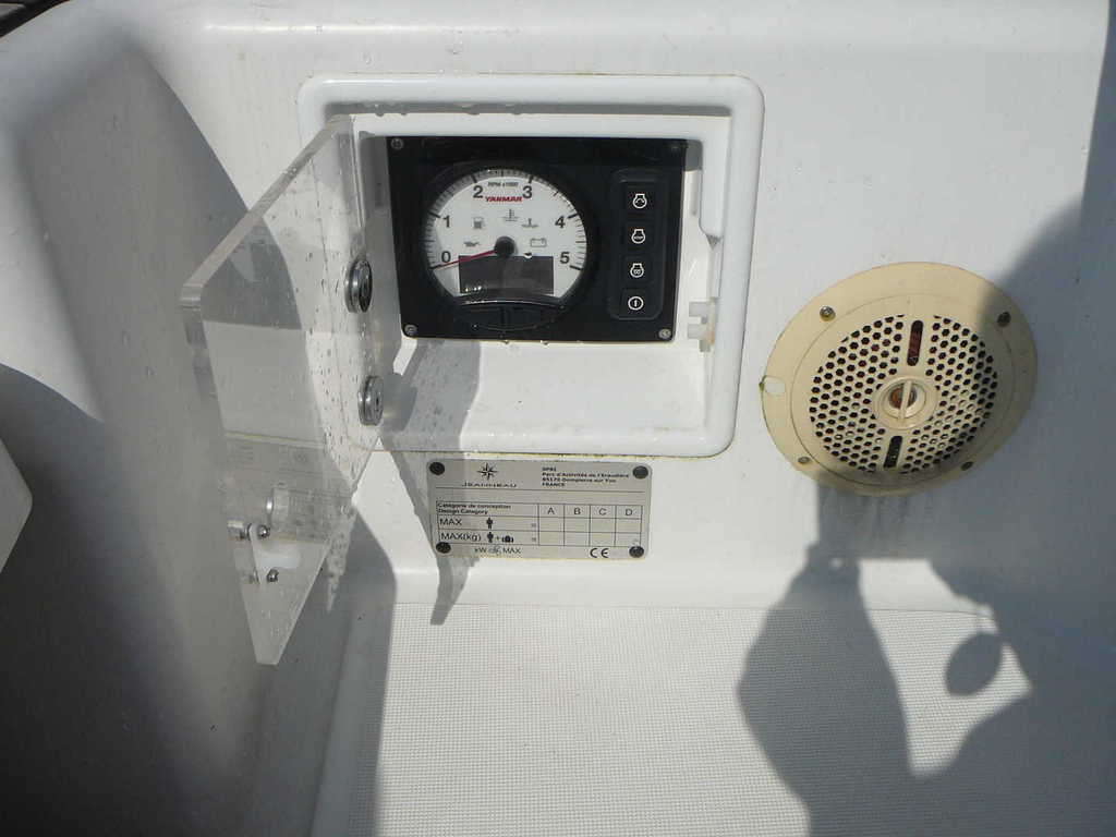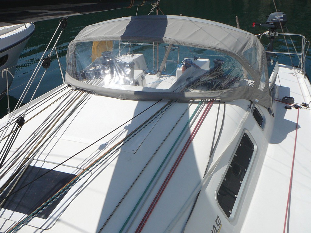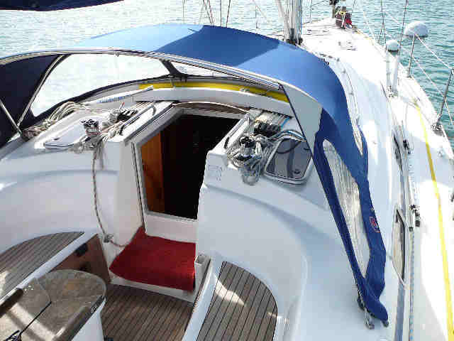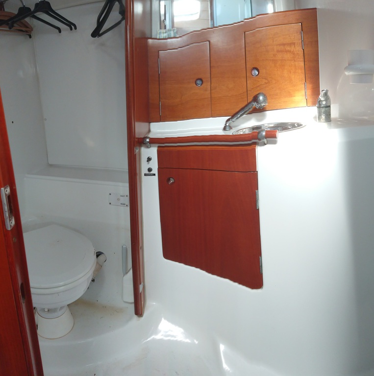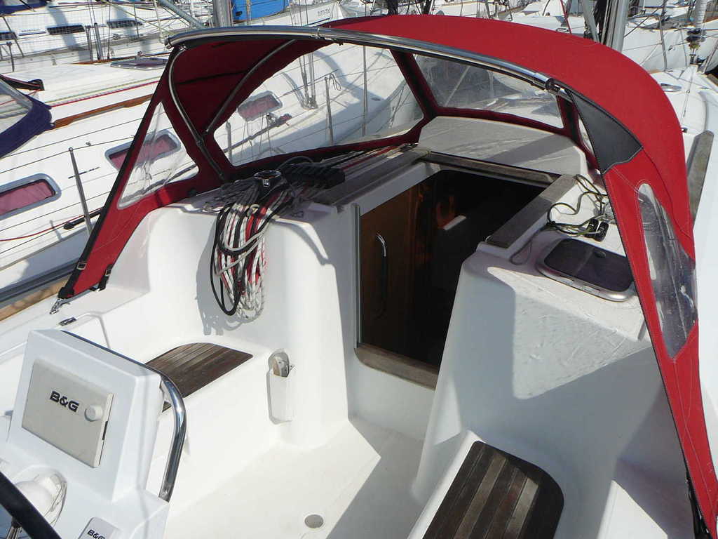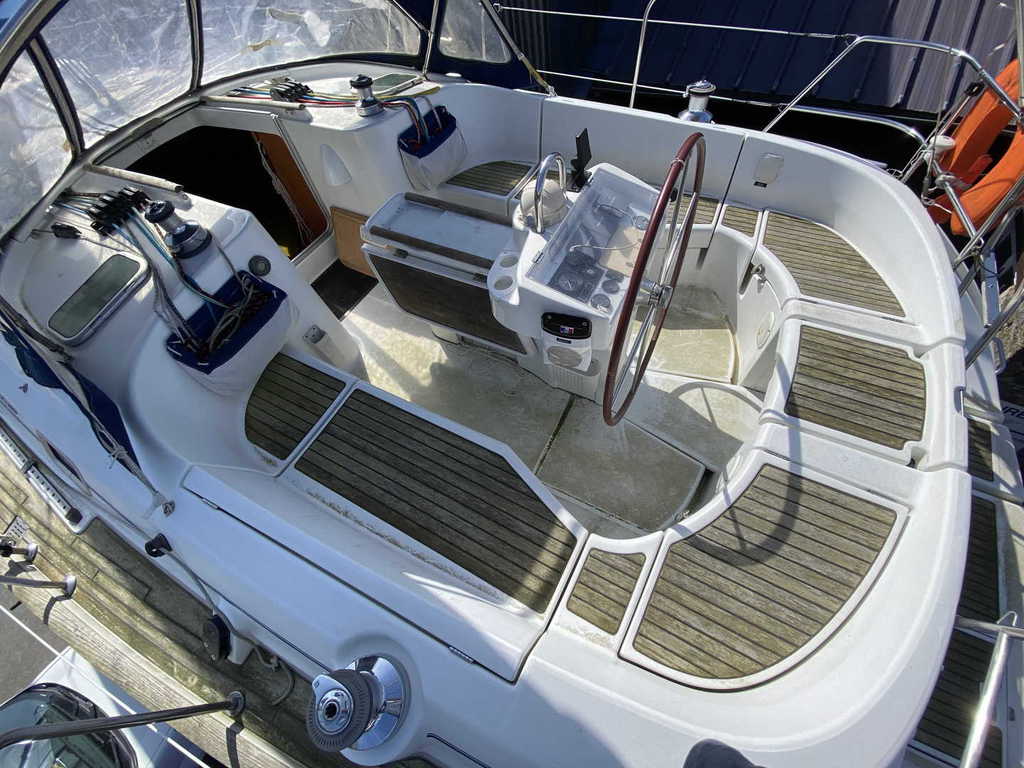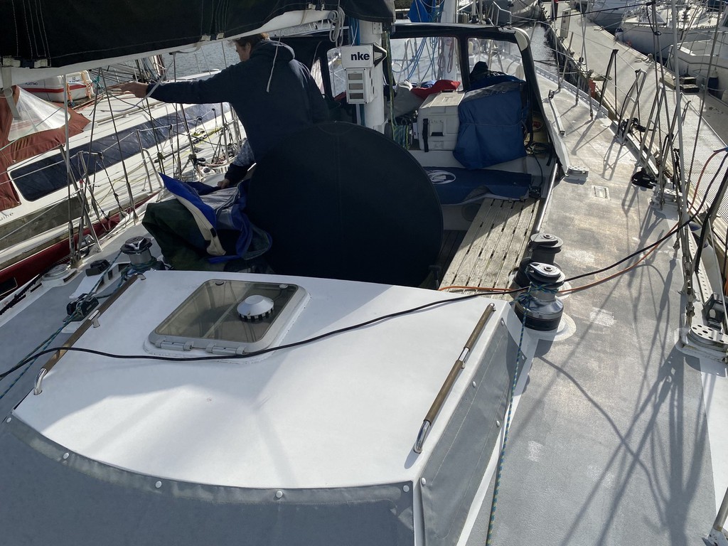 cartes, radar, VHF. Bateau bien équipé avec capote de roof, eau chaude, table de cockpit, annexe et HB.