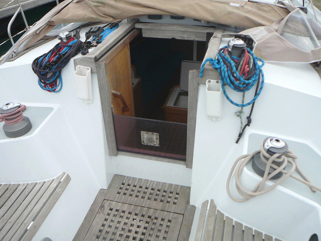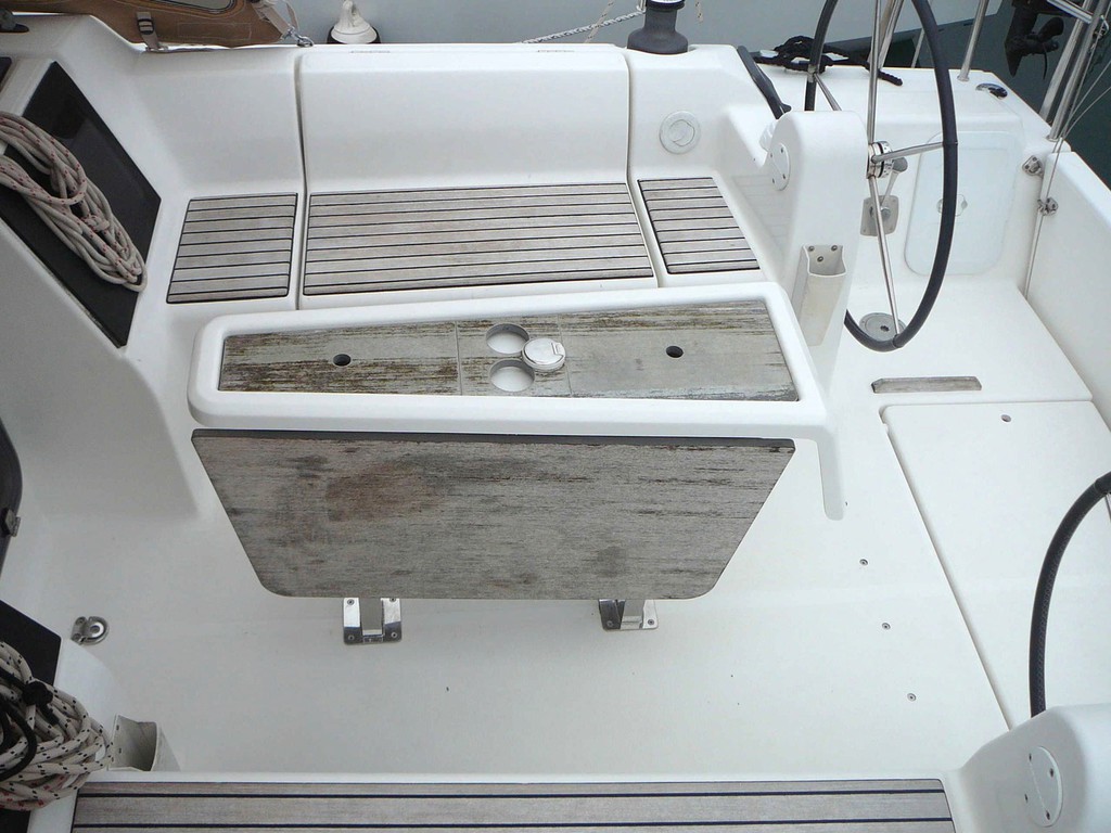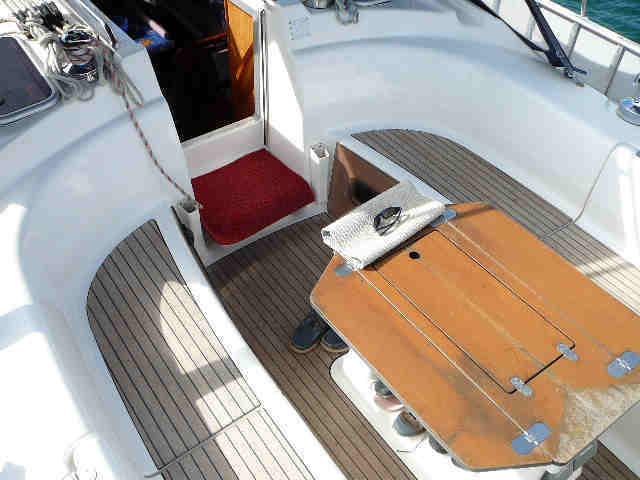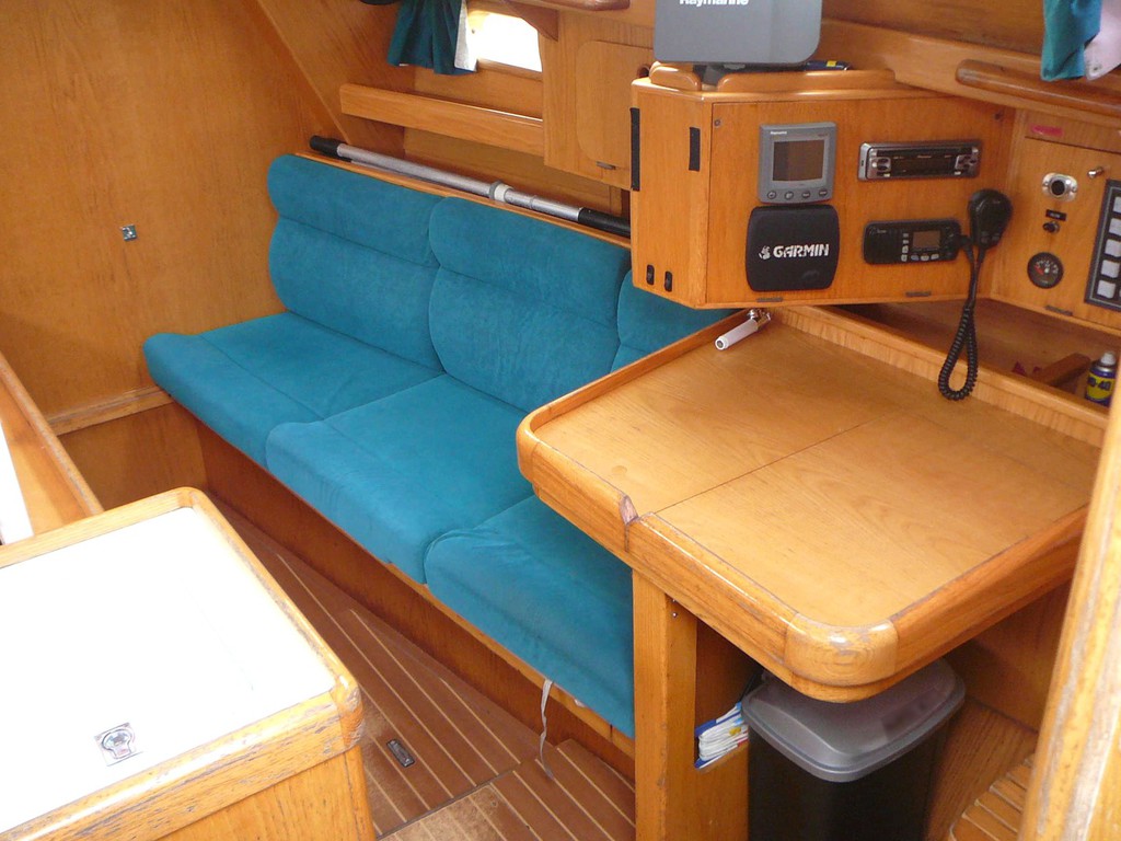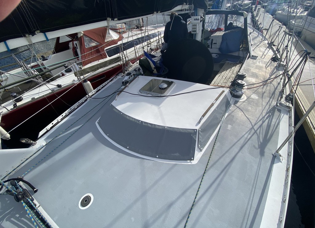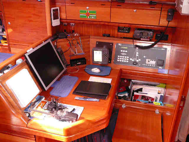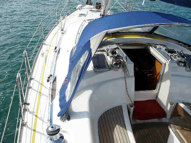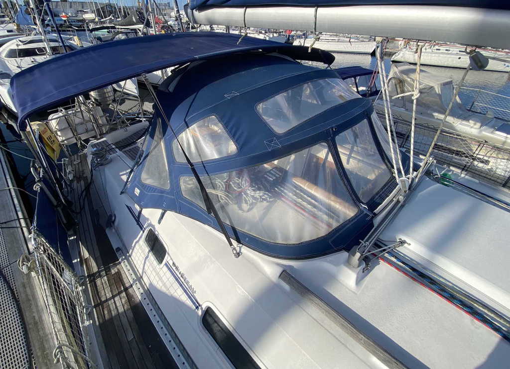 cartes, radar, VHF. Bateau bien équipé avec capote de roof, eau chaude, table de cockpit, annexe et HB.