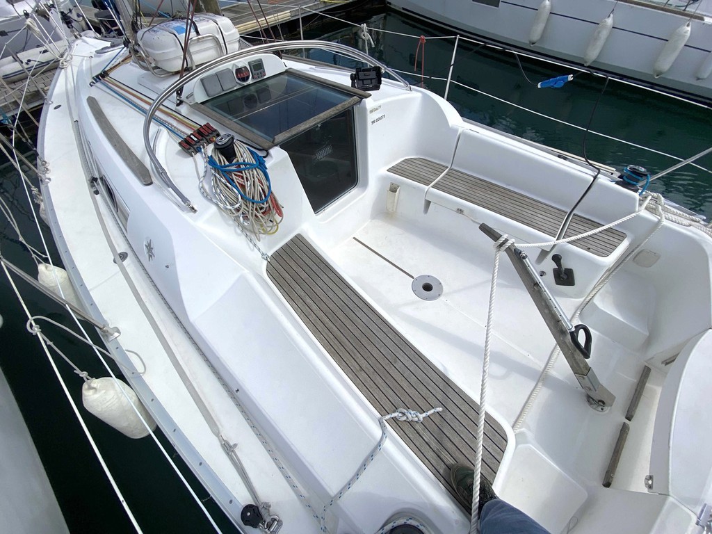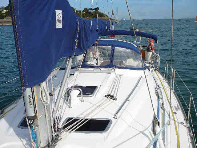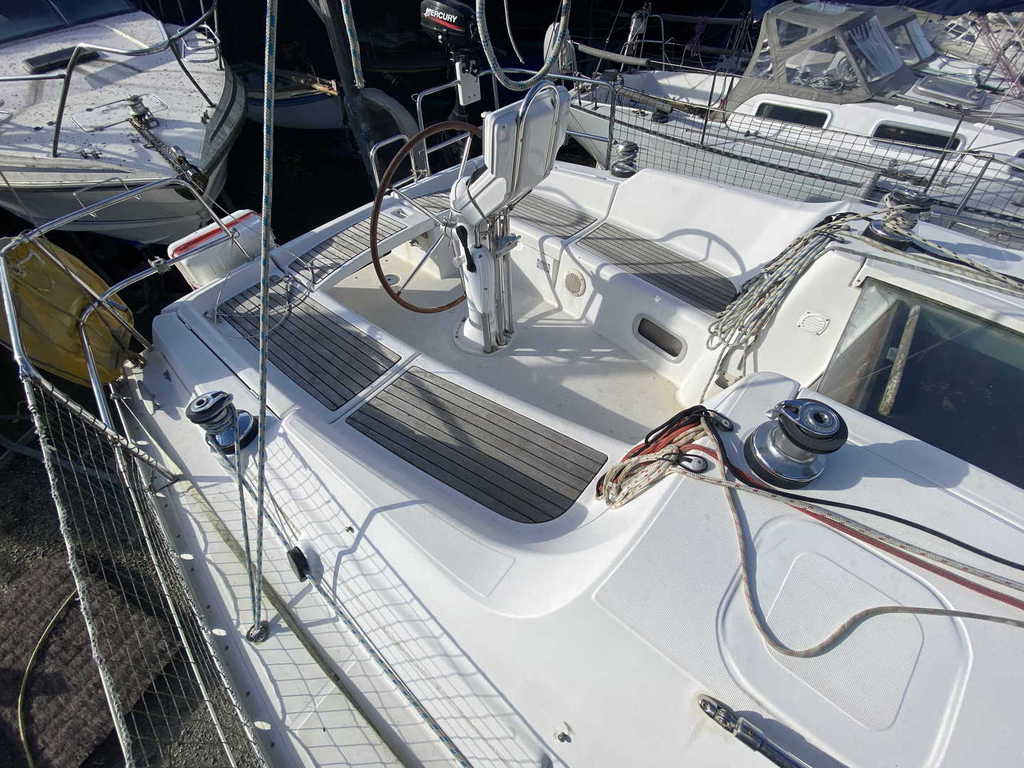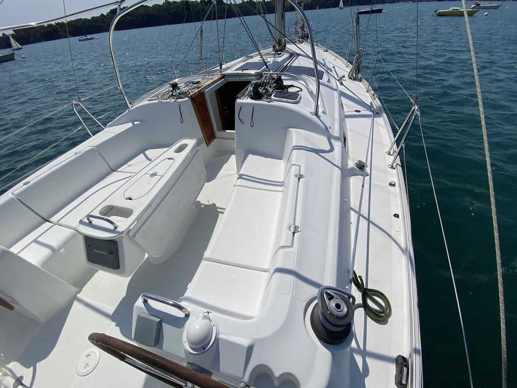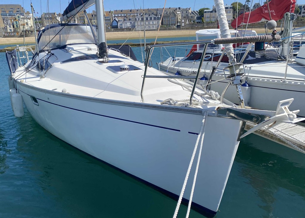 Océanis 323 Clipper. Bateau occasion visible en Bretagne. Equipé d'un moteur Yanmar de 21cv. Aménagé avec 2 cabines. Bateau en très bon état, propre et bien entretenu. Jeu de voiles complet avec spi et gennaker. Electronique complète Raymarine, pilote, GPS lecteur de cartes AXIOM, VHF. Bien équipé avec capote de descente, eau chaude, table de cockpit,barre à roue, annexe et hb