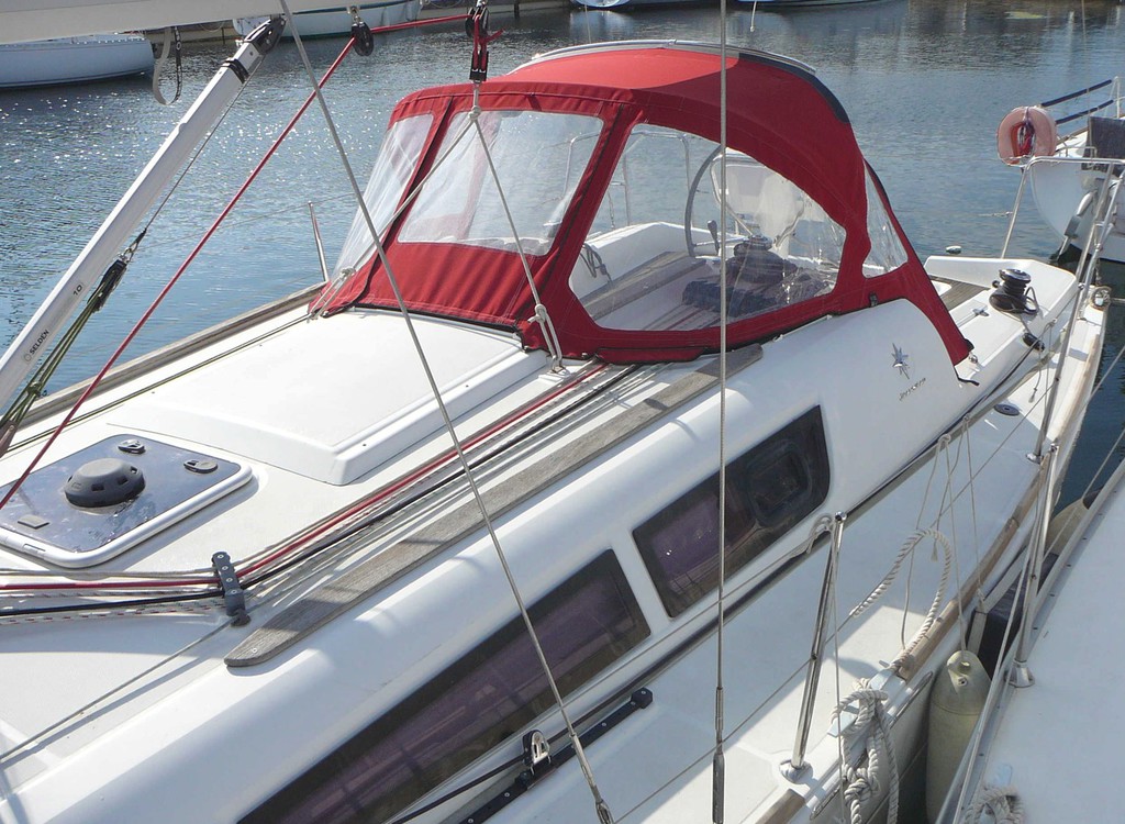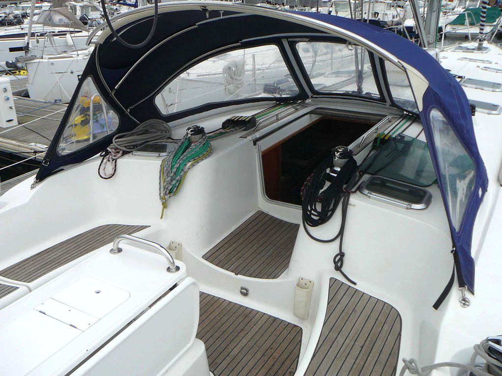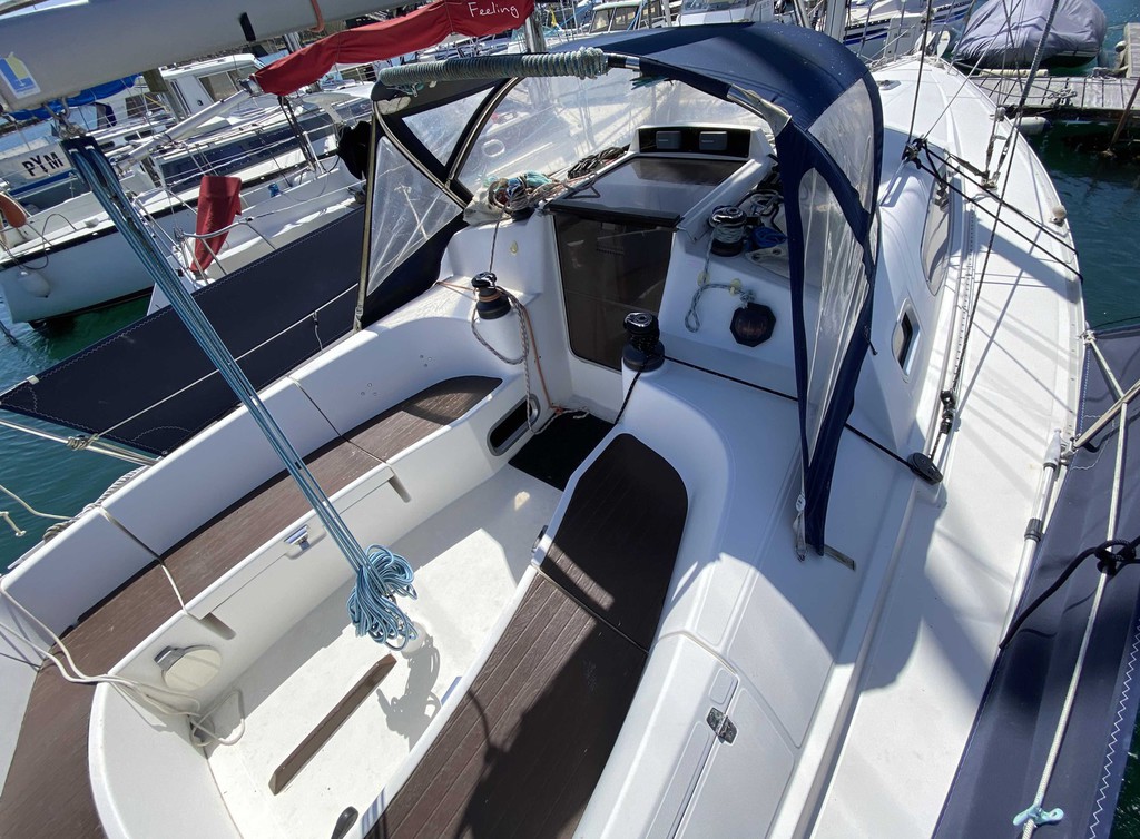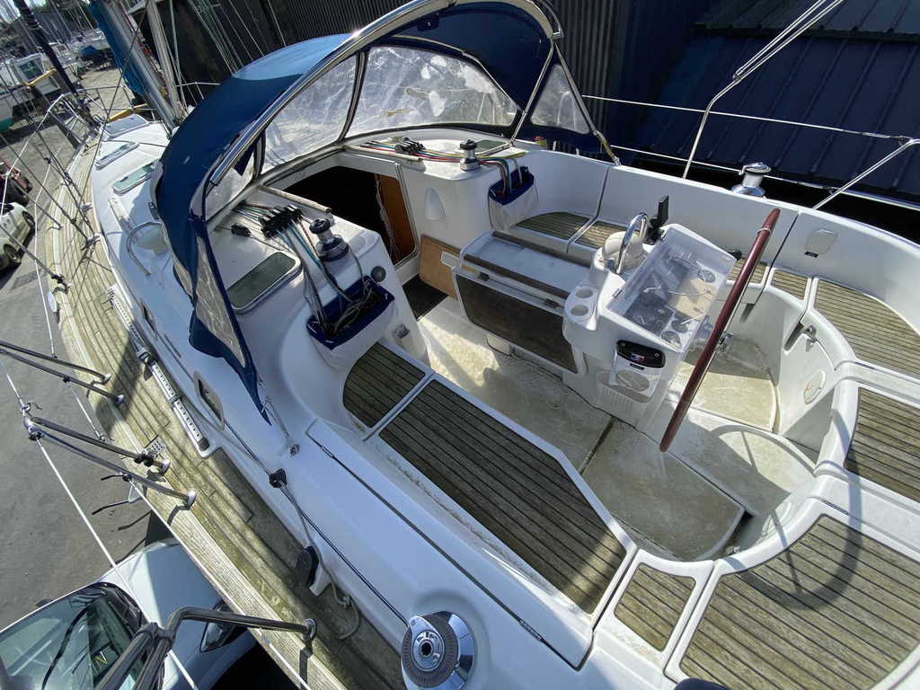 Océanis 323 Clipper. Bateau occasion visible en Bretagne. Equipé d'un moteur Yanmar de 21cv. Aménagé avec 2 cabines. Bateau en très bon état, propre et bien entretenu. Jeu de voiles complet avec spi et gennaker. Electronique complète Raymarine, pilote, GPS lecteur de cartes AXIOM, VHF. Bien équipé avec capote de descente, eau chaude, table de cockpit,barre à roue, annexe et hb