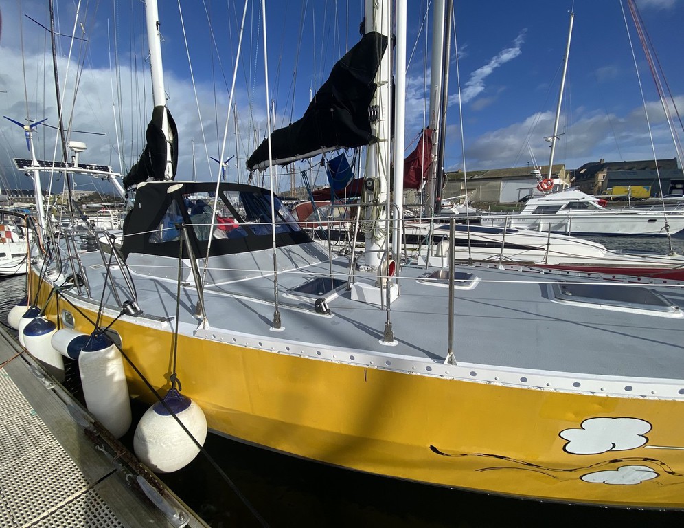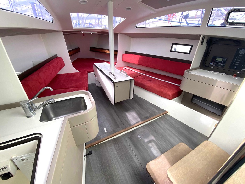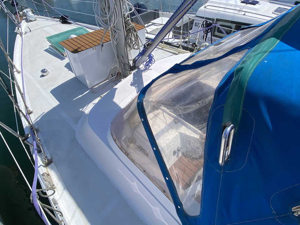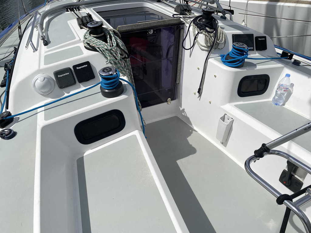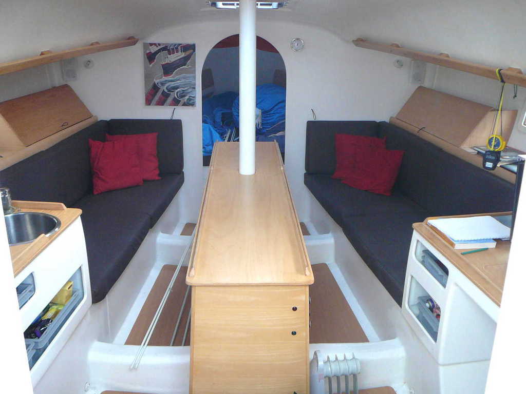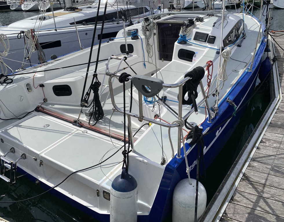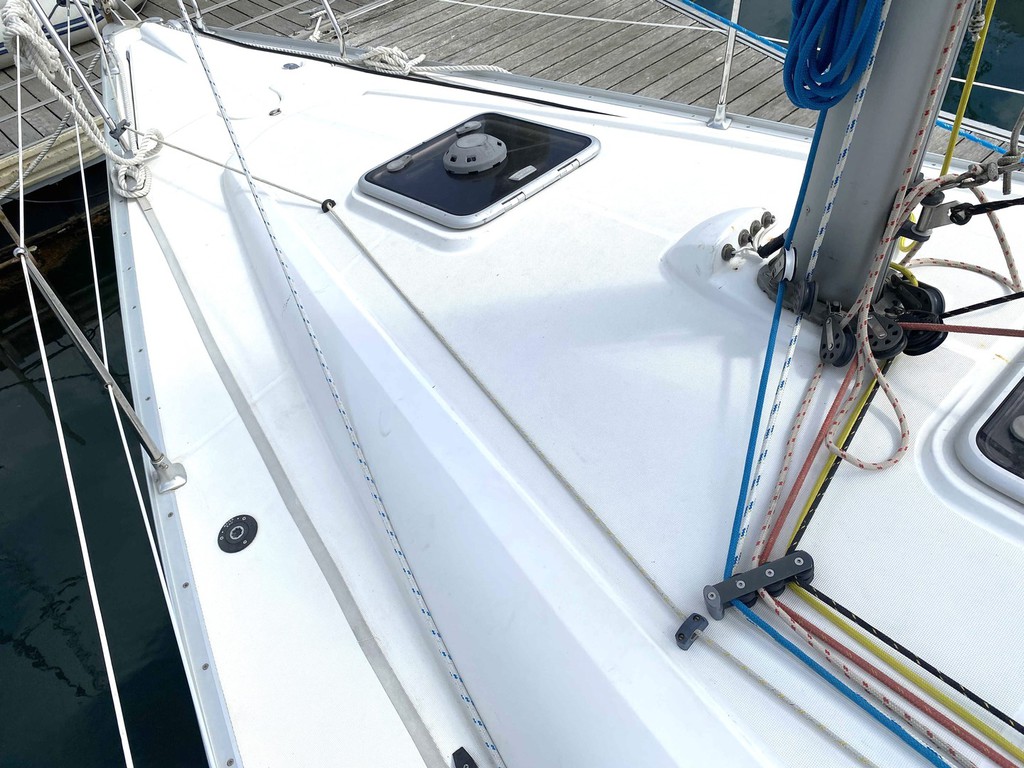 dériveur. Aménagé avec 2 cabines. Equipé d’un moteur de 19 cv. Equipements électronique Raymarine complet neuf avec lecteur de cartes et pilote, AIS. Jeu de voiles complet et quasi neuf avec spi