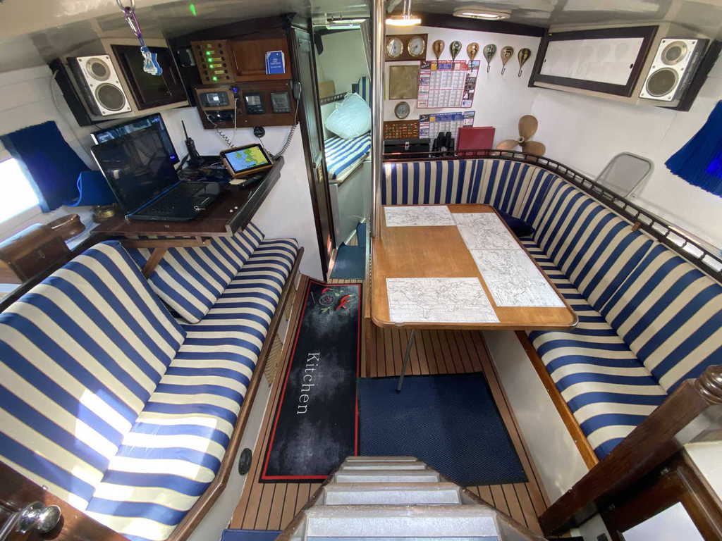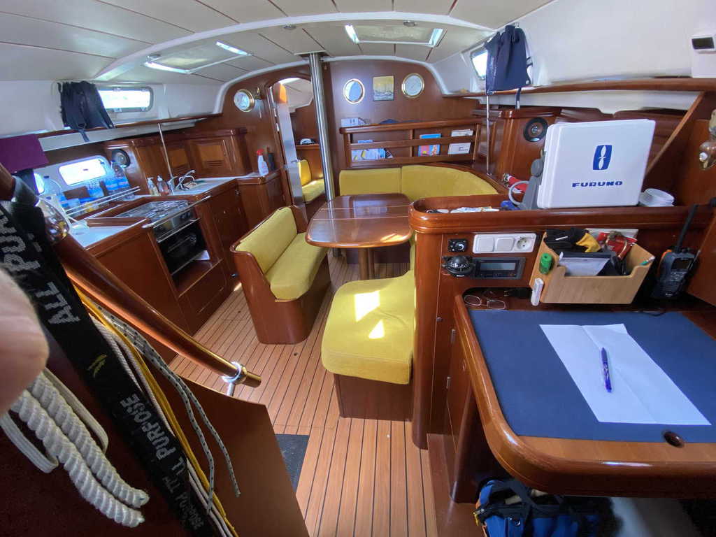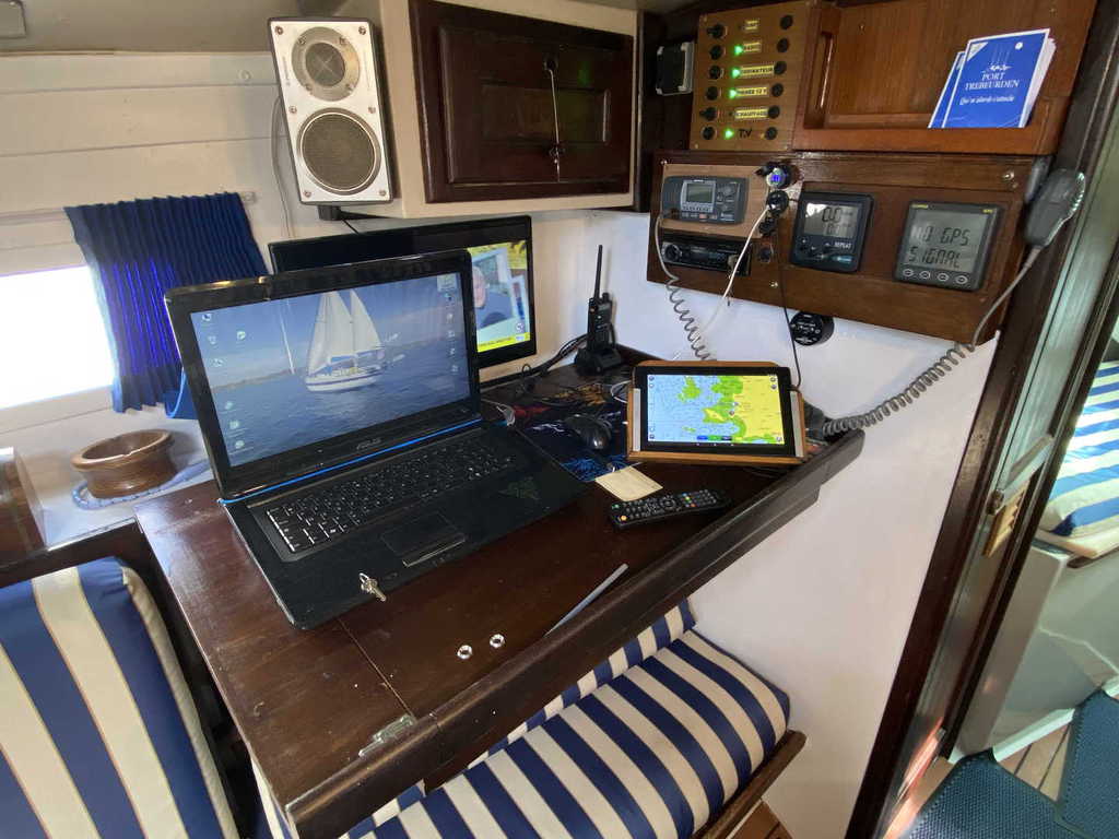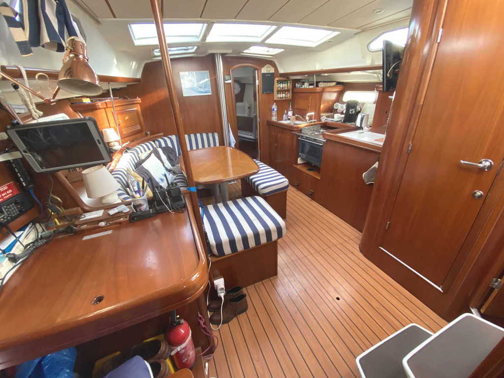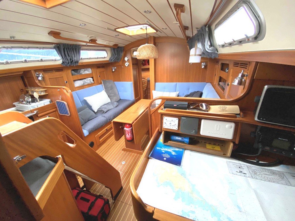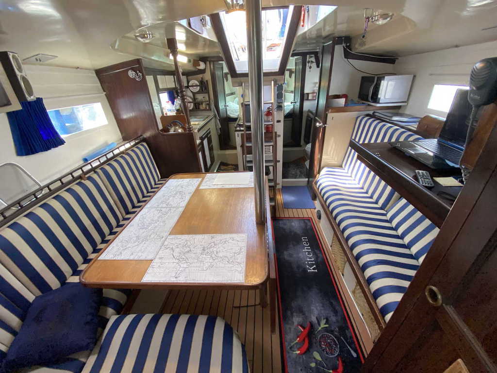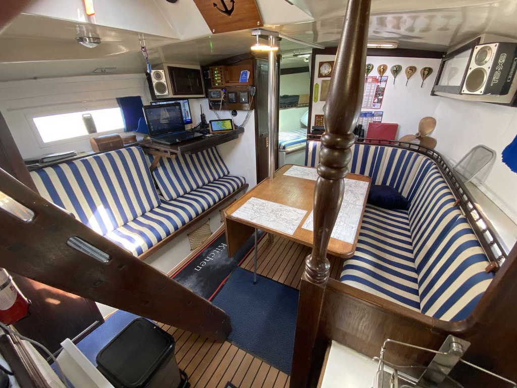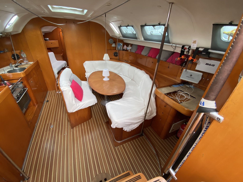 carré très confortable. Equipé d’un moteur de 50 cv. Jeu de voiles complet avec GV, artimon, génois et spi. Electronique complète avec GPS lecteur de cartes, pilote, AIS, PC avec cartographie, vhf,
