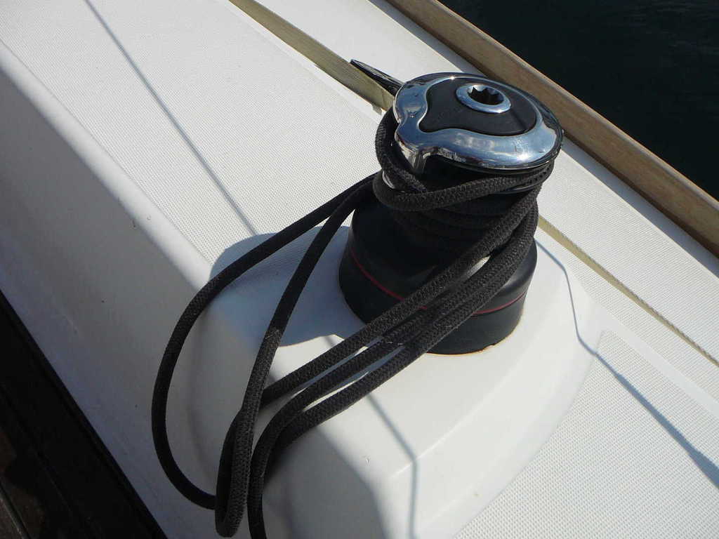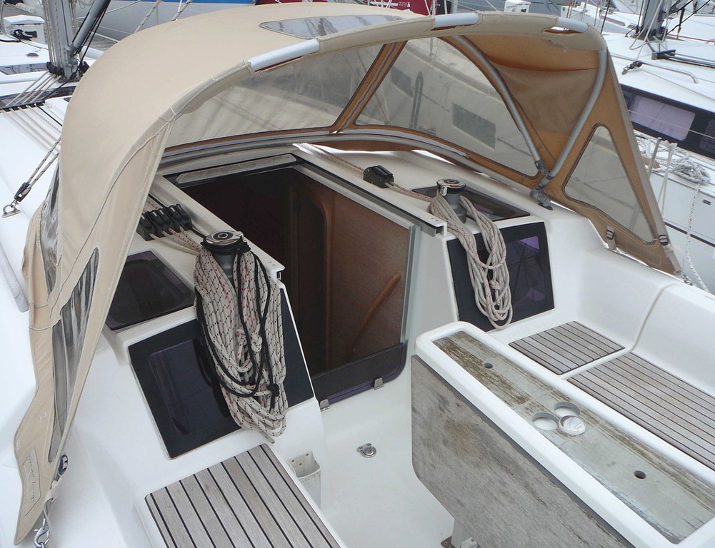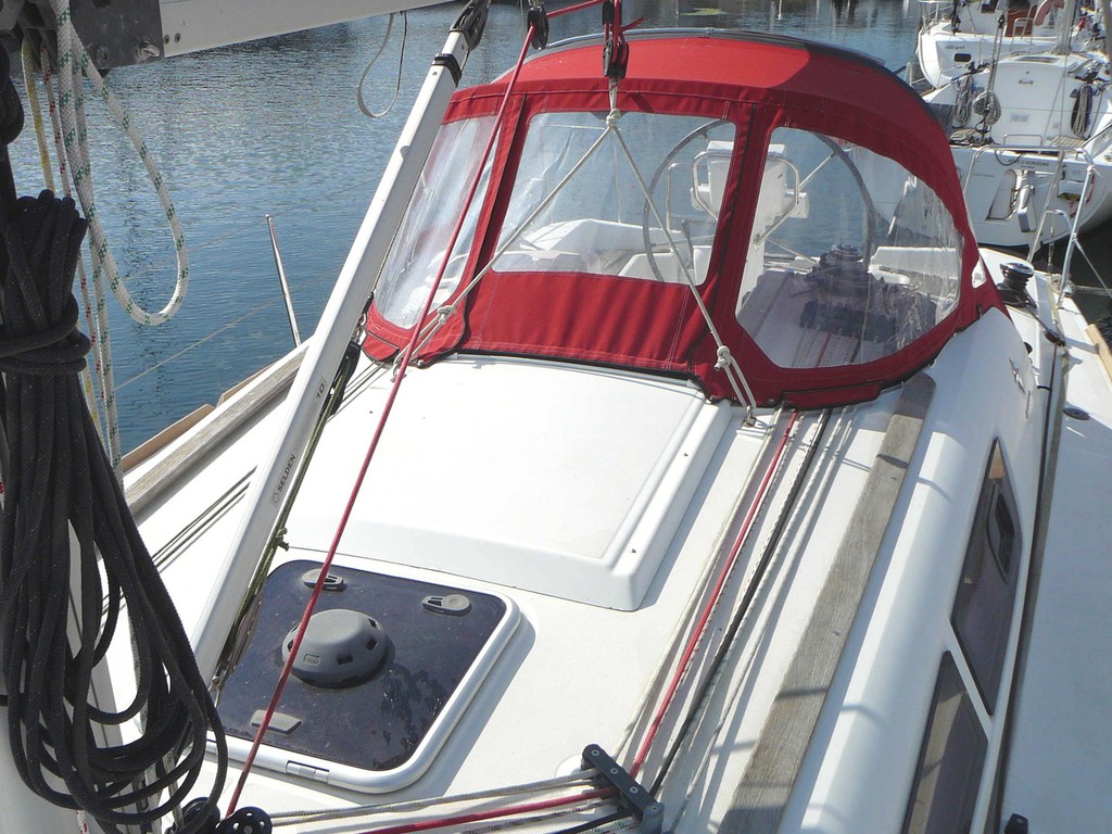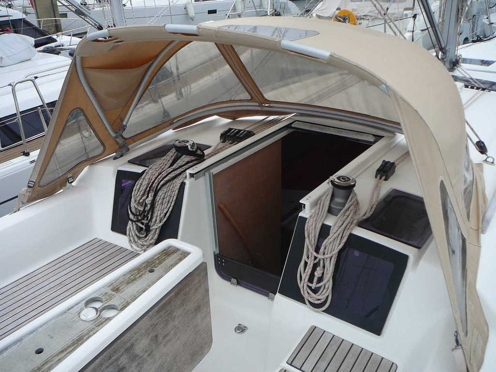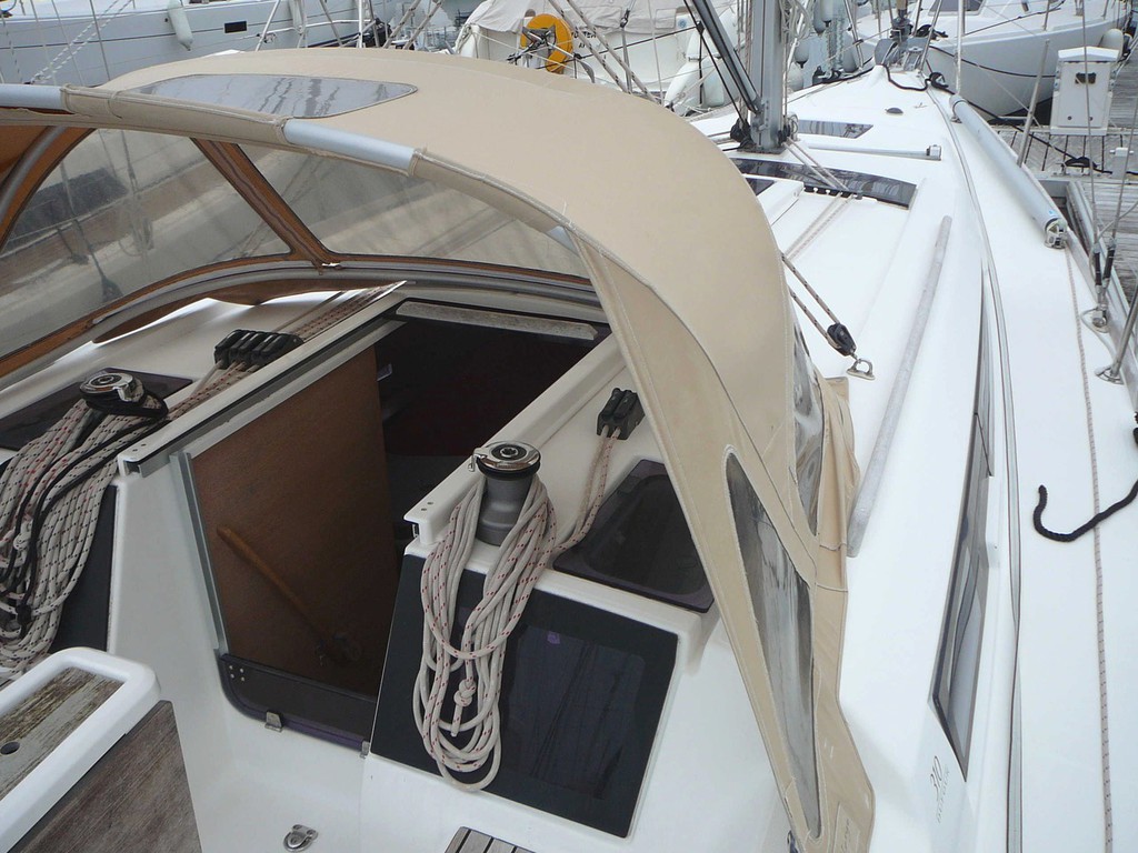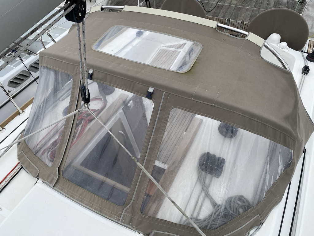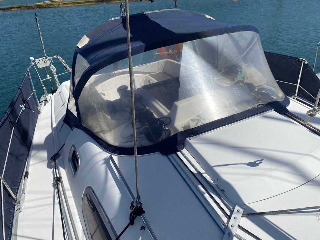 Bateau bien équipé avec capote, guindeau électrique, portique, annexe et HB.
