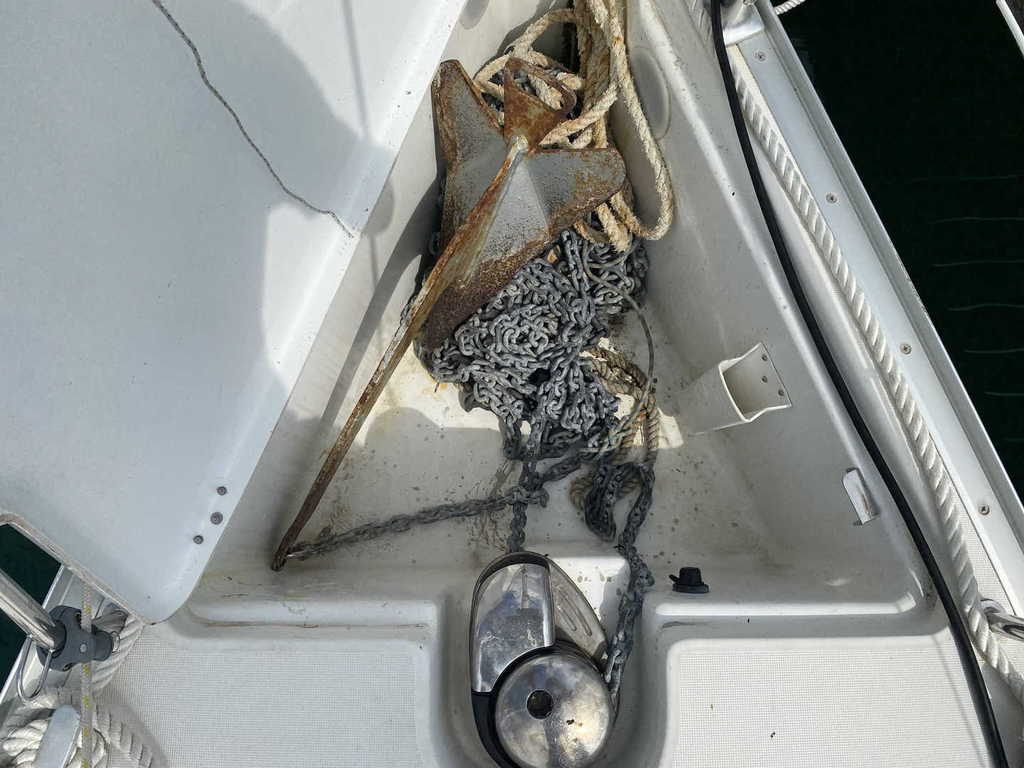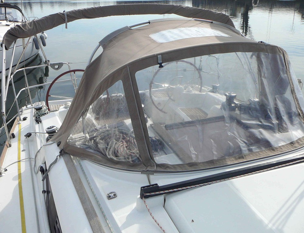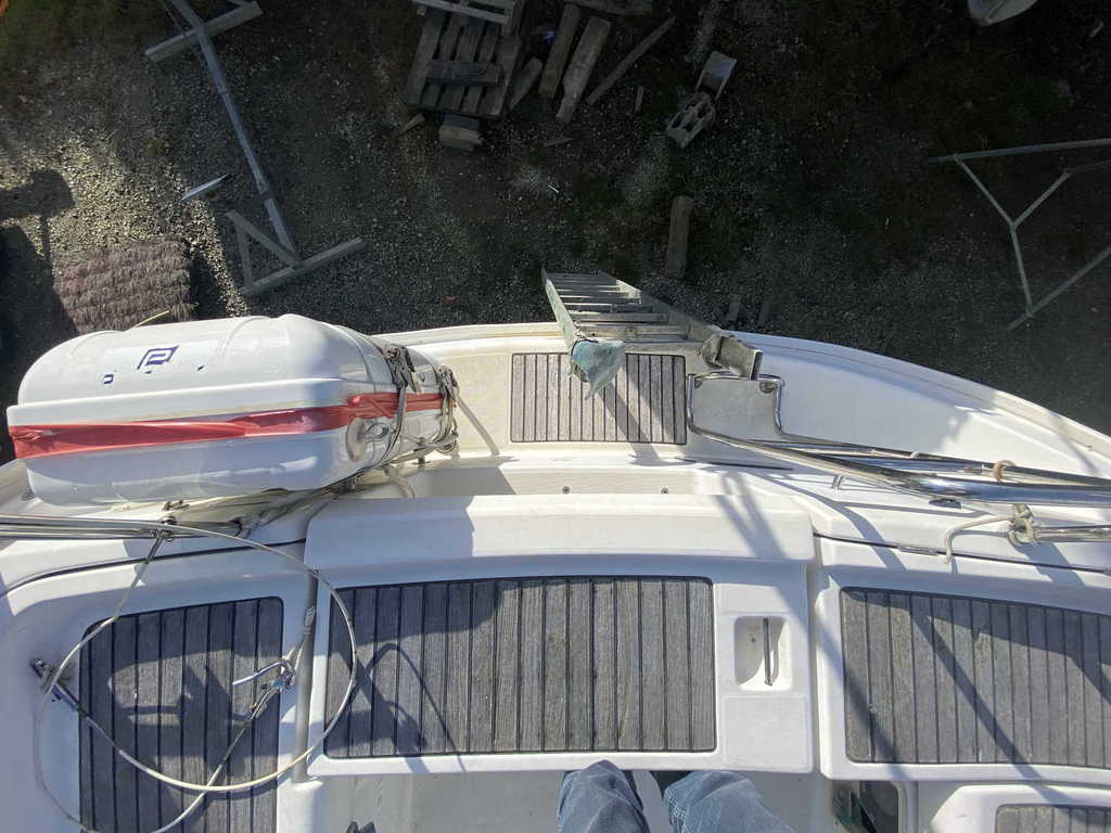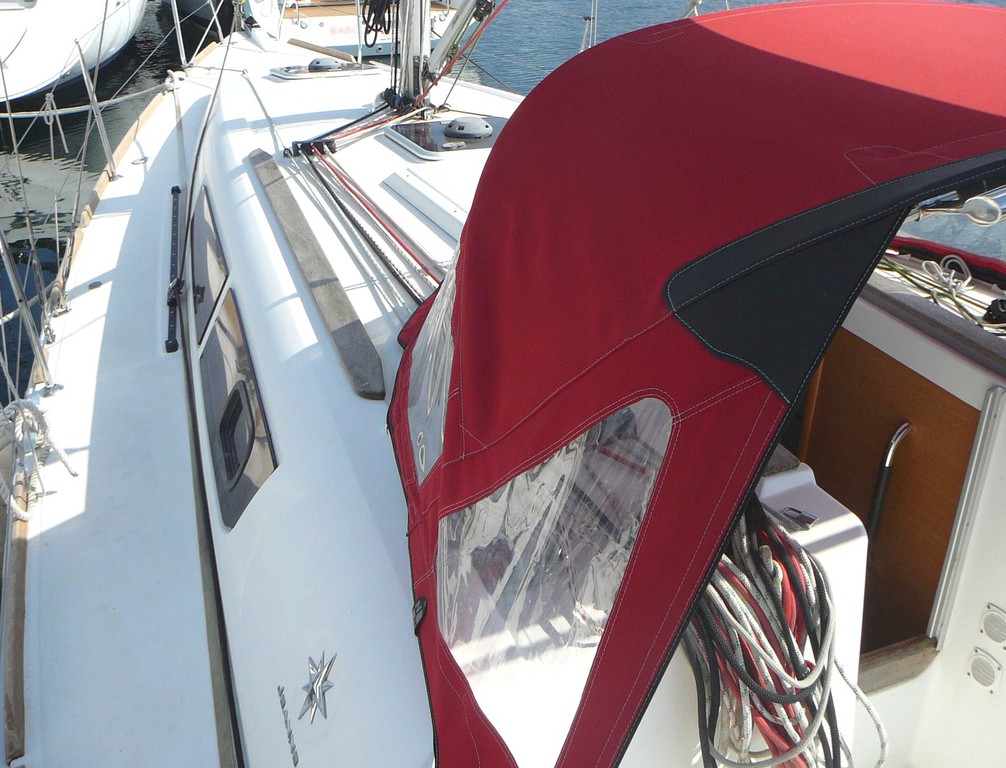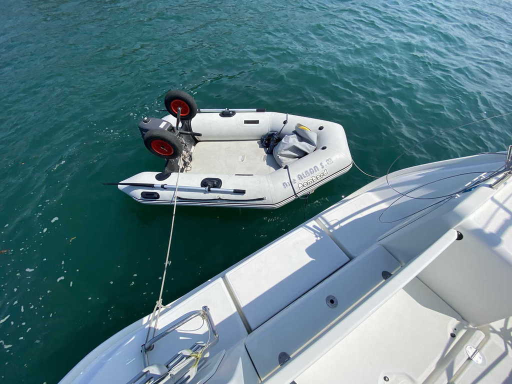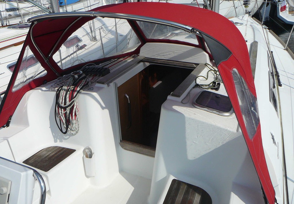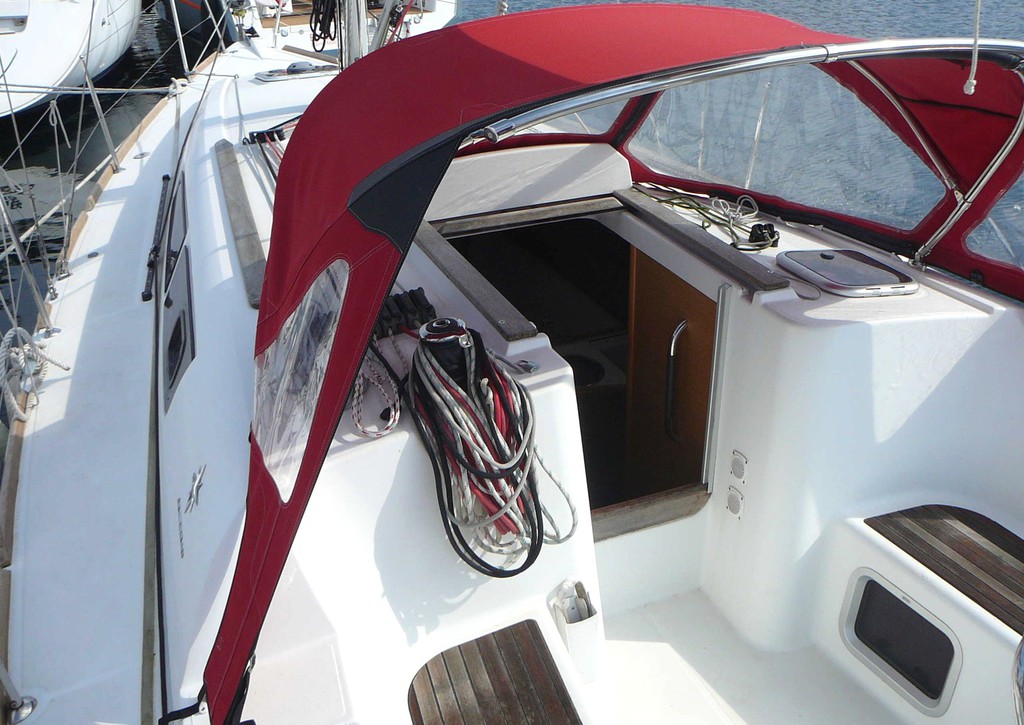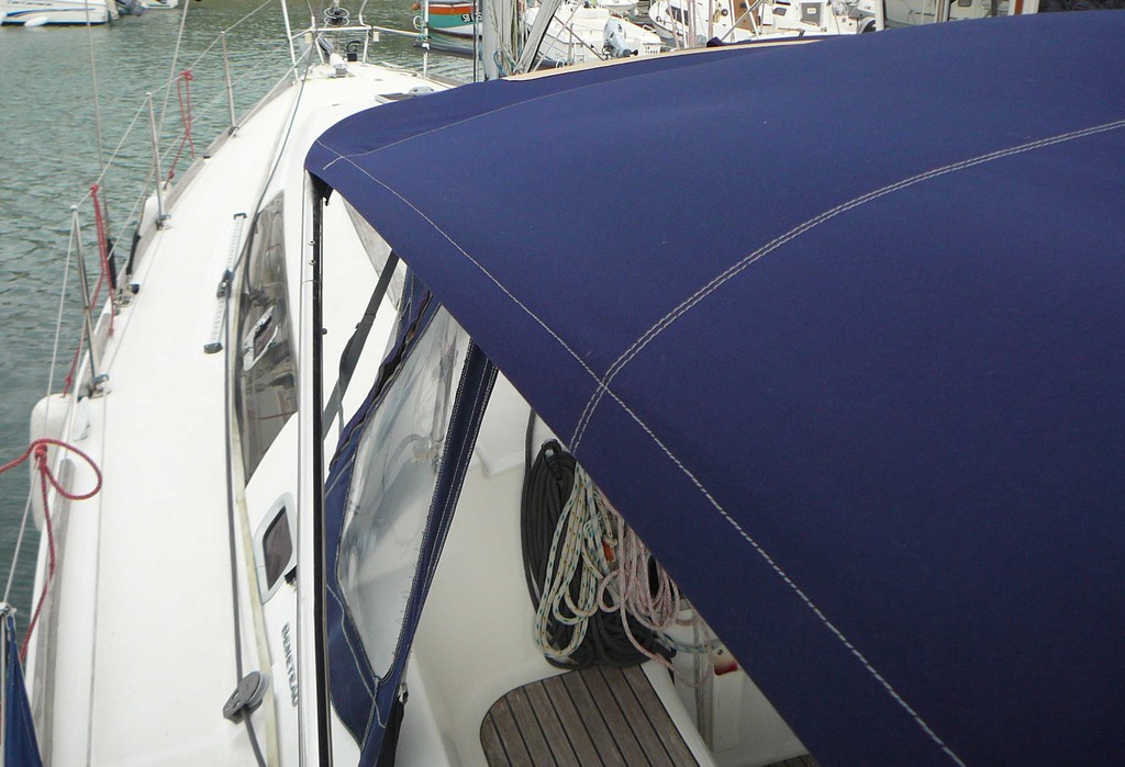 Bateau bien équipé avec capote, guindeau électrique, portique, annexe et HB.