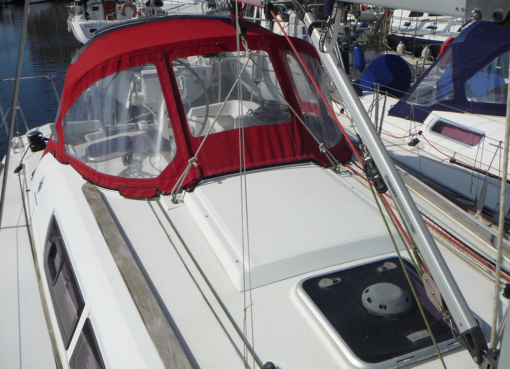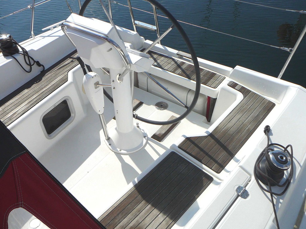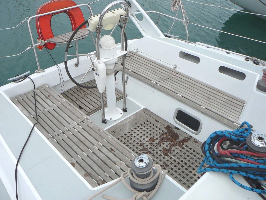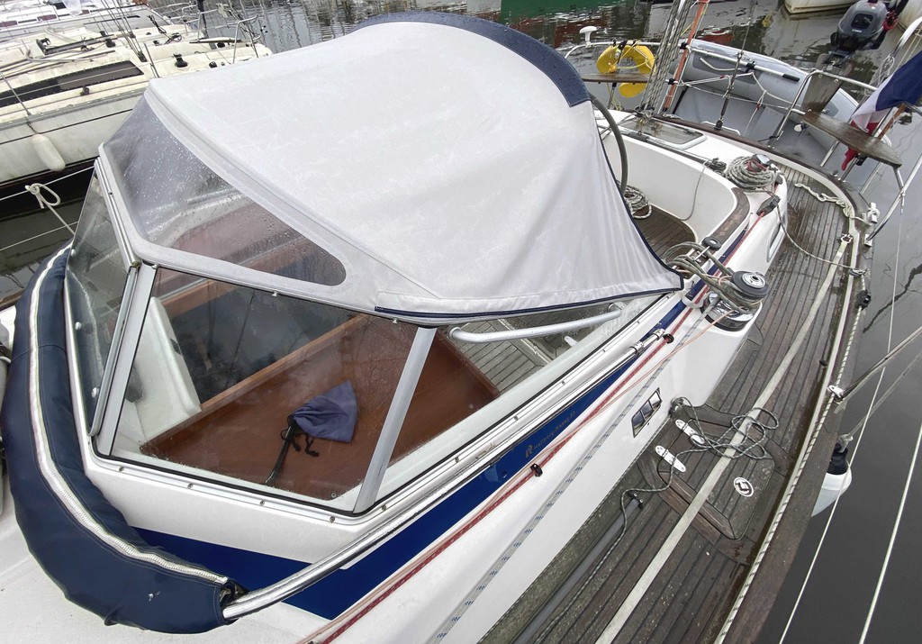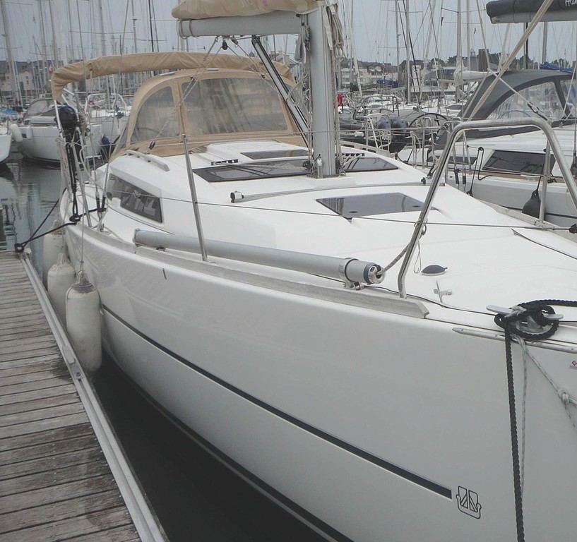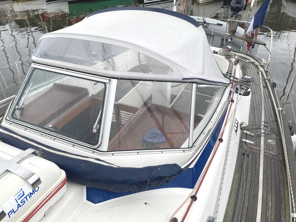 Dufour 310 Grand Large. Bateau d’occasion visible en Bretagne. Superbe voilier au style affiné, confortable, et facile à manœuvrer avec son foc autovireur. Cockpit spacieux avec ses 2 barres à roues. Aménagé avec 2 cabines. Equipé d’un moteur de 19 cv. Equipements électronique complet avec lecteur de cartes, pilote. Bateau très bien équipé avec capote de roof, Bimini, chauffage, guindeau électrique, annexe. Place de port.